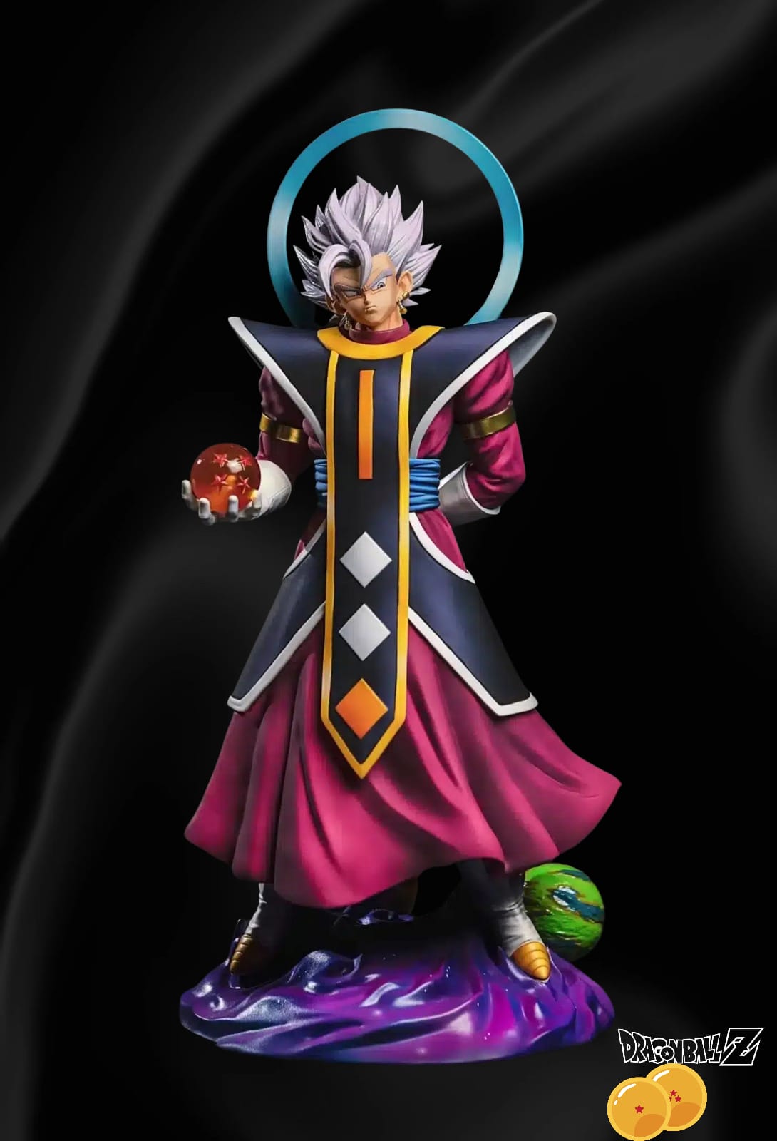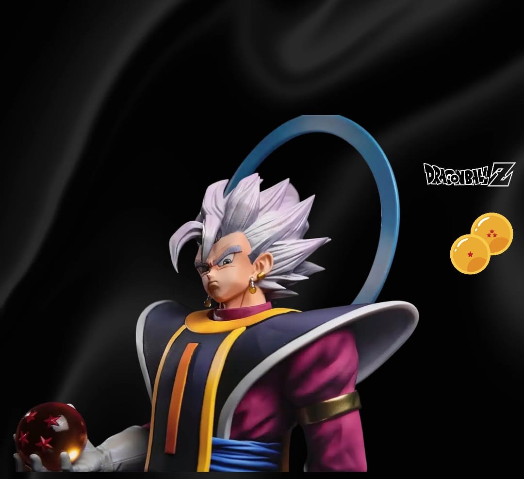 Design Features: The statue features Vegito with silver hair, wearing the Grand Priest's signature dark blue and magenta robes with a yellow-bordered center tabard and a blue halo behind his head. He is shown holding a Dragon Ball.