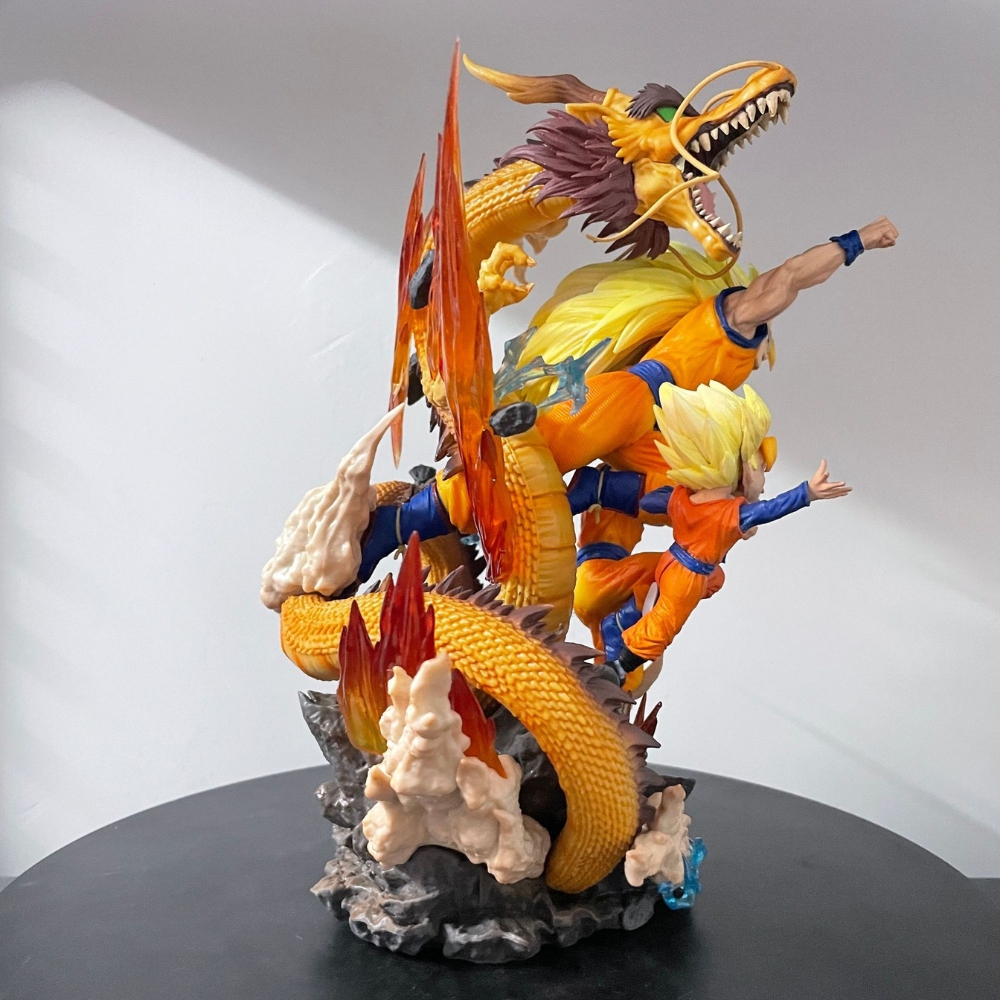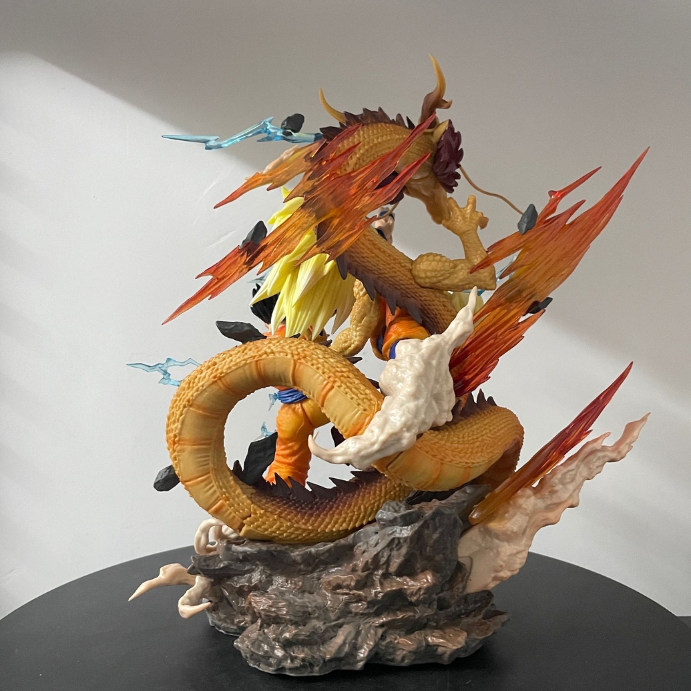 The figure is a highly detailed collectible, often crafted from premium PVC material. It captures the characters in dynamic, high-energy poses with explosive sculpting that includes details like Goku's flowing golden hair and swirling energy from Shenron.